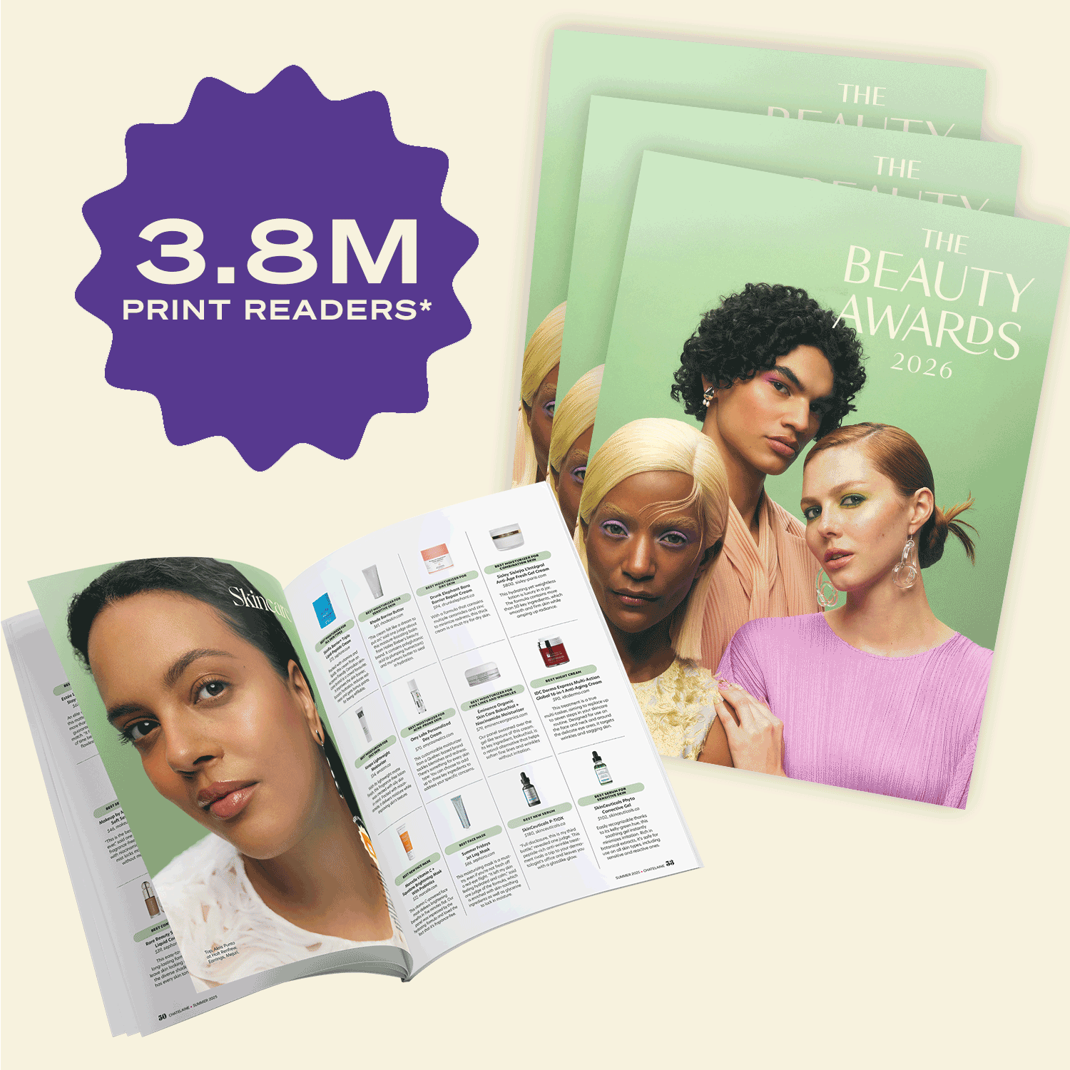 The Beauty Awards is published in print as a special editorial feature within FASHION, Chatelaine, Châtelaine and HELLO Canada. Together, these magazines reach over 3.8M readers per issue.
